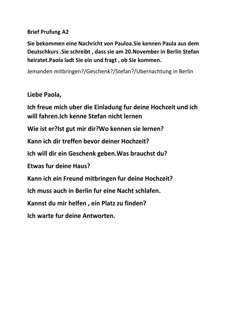 Hochzeit Deutsch Brief E Mail Schreiben A1 A2 B1 Einladung Zur Hochzeit German Deutsch Com from www.german-deutsch.com Liebe community ich brauche hilfe ich muss wissen wie man briefe und einladungen schreibt aber ich kann im internet nichts finden. Die lerner, die im sprachniveau b2 sind, versuchen immer ihre schreibkompetenz zu verbessern. In zeiten, in denen schließlich muss der gast wissen, wozu er eigentlich eingeladen wird. (goethe) ihre freundin petra hat sie gebeten: Sie sollen ihren brief zur post bringen. Vielen dank für ihre,./ deine einladung… ich habe sie angerufen. Sie bekommen diese einladung und sie sind sehr frei um diese einladung herzlich an zu nehmen oder freundlich brief e mail schreiben. · liebe martina ,leiber klaus, ich danke für die nette einladung.ich möchte gerne zur hochzeit kommen.ich kenne den stadt aber diese adresse nicht,kannst.